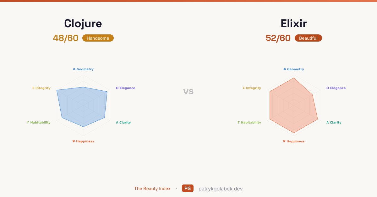 Elixir scores 52/60 against Clojure's 48/60, leading in 4 of 6 dimensions. Clojure owns mathematical and design while Elixir leads in aesthetic and human. The widest gap sits on Aesthetic Geometry, where Elixir's 3-point lead over Clojure shapes most of the pair's character.
