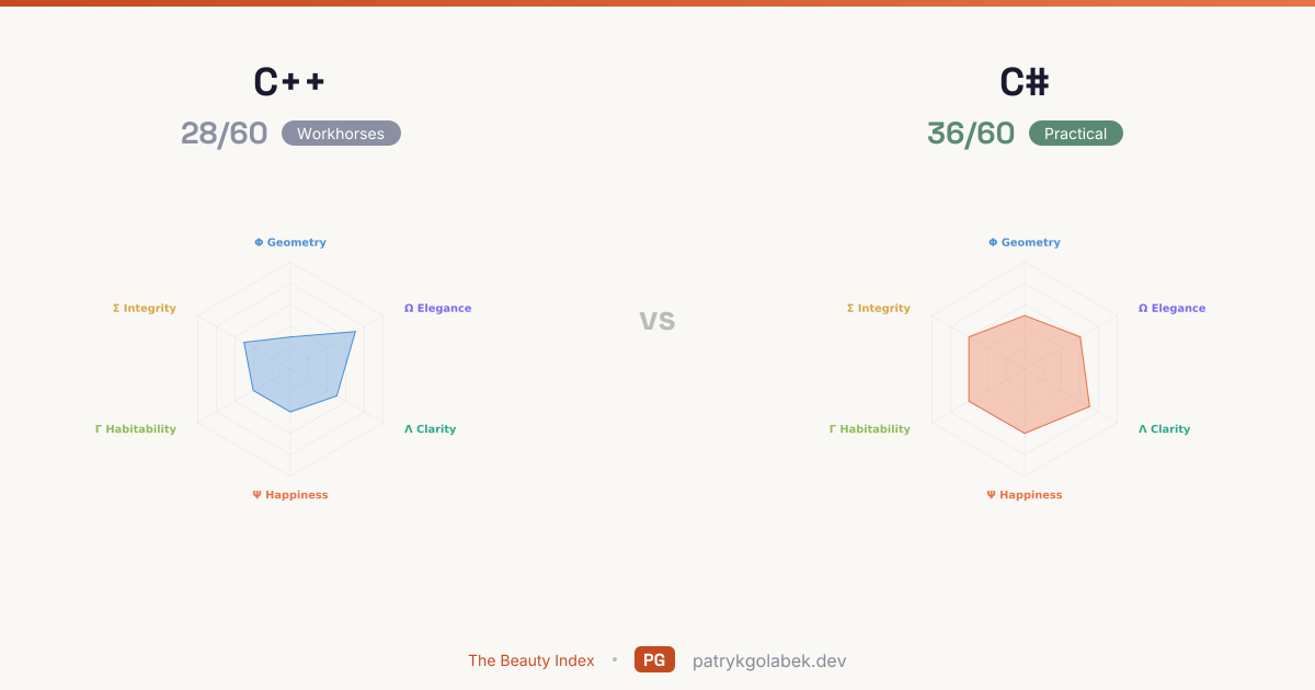C# wins Aesthetic Geometry by 2 points — a decisive visual advantage. C# has reduced ceremony significantly with top-level statements, records, and file-scoped namespaces. But the language's Java-era heritage still shows in verbose patterns, property accessors, attribute decorations, and using blocks add visual weight. Improving, but not yet clean. The visual gap between the two is not subtle — where C# prizes geometric calm, C++ trades that serenity for other commitments. Template metaprogramming, #include chains, and nested angle brackets (std::vector<std::pair<int, std::string>>) create some of the most visually dense code in any language. Modern C++ is cleaner, but the language's visual floor is very low. In a language where expressiveness is the selling point, visual calm amplifies the advantage.
