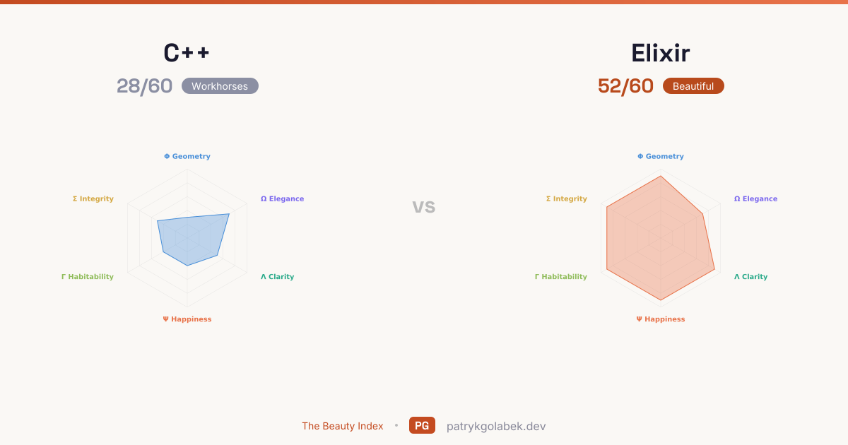 Elixir scores 52/60 against C++'s 28/60, leading in 5 of 6 dimensions. Elixir dominates the aesthetic, human, and design axes. Read the comparison through Aesthetic Geometry first: Elixir wins that axis by 6 points over C++, and it is the single best lens on the pair.