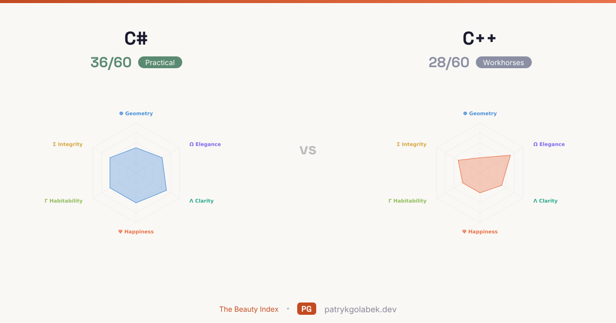 - C# lands in the practical tier at 36/60; C++ in the workhorses tier at 28/60. The gap is wide enough to matter in day-to-day experience. Pick the higher scorer unless a hard constraint pushes otherwise. The score difference reflects years of community use, tooling maturity, and the editorial judgment of the Beauty Index rubric.