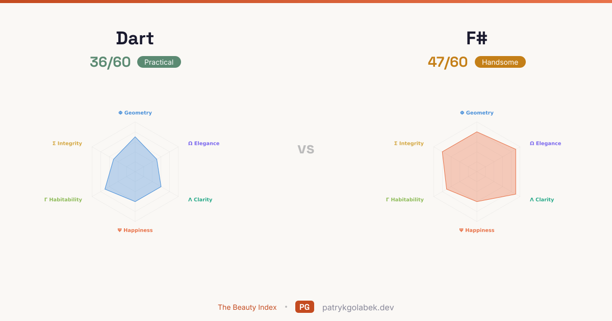 - Dart lands in the practical tier at 36/60; F# in the handsome tier at 47/60. The gap is wide. Unless a specific platform or ecosystem constraint forces the other choice, go with the higher-scoring language. The score difference reflects years of community use, tooling maturity, and the editorial judgment of the Beauty Index rubric.