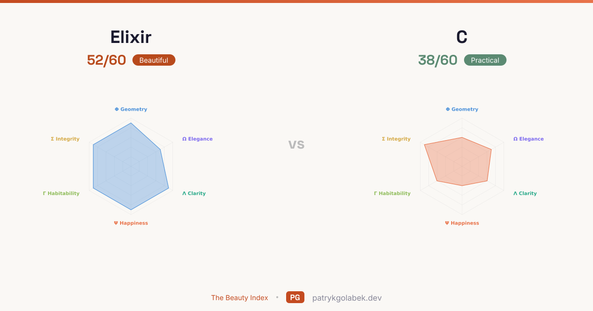- Elixir lands in the beautiful tier at 52/60; C in the practical tier at 38/60. With this much daylight between them, the higher scorer is the default and the lower scorer needs a business case. The score difference reflects years of community use, tooling maturity, and the editorial judgment of the Beauty Index rubric.