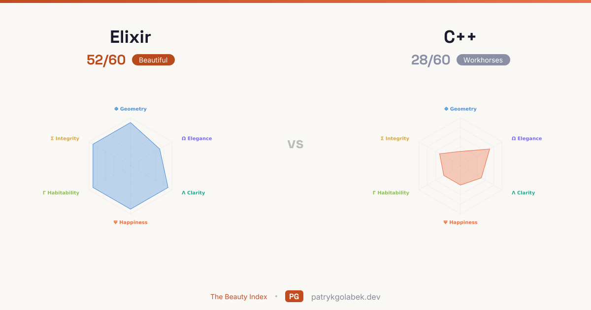 Elixir scores 52/60 against C++'s 28/60, leading in 5 of 6 dimensions. Elixir dominates the aesthetic, human, and design axes. Aesthetic Geometry is where the pair separates most cleanly — Elixir leads C++ by 6 points and that gap colours everything else on the page.