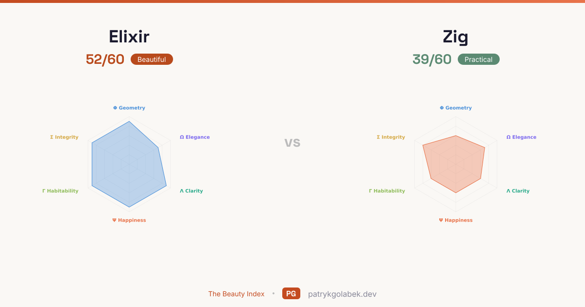 - Elixir lands in the beautiful tier at 52/60; Zig in the practical tier at 39/60. With this much daylight between them, the higher scorer is the default and the lower scorer needs a business case. The score difference reflects years of community use, tooling maturity, and the editorial judgment of the Beauty Index rubric.