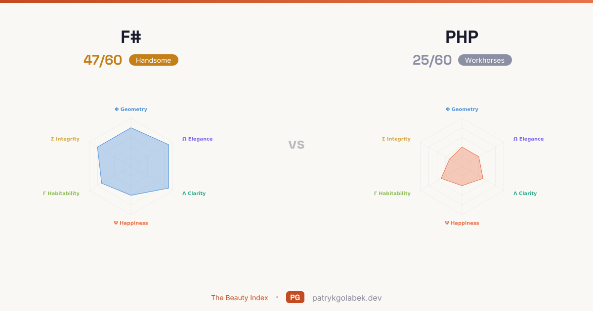 F# scores 47/60 against PHP's 25/60, leading in 6 of 6 dimensions. F# dominates the aesthetic, mathematical, human, and design axes. The widest gap sits on Mathematical Elegance, where F#'s 5-point lead over PHP shapes most of the pair's character.