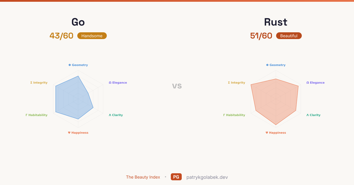 Rust scores 51/60 against Go's 43/60, leading in 4 of 6 dimensions. Rust dominates the aesthetic, mathematical, human, and design axes. Choose Rust if the next six months are what matter, Go if the next six years are.