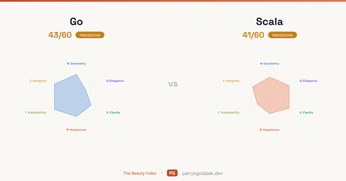 - Go lands in the handsome tier at 43/60; Scala in the handsome tier at 41/60. The gap is narrow enough that team familiarity and ecosystem fit should decide. Pick the one your hires already know. The score difference reflects years of community use, tooling maturity, and the editorial judgment of the Beauty Index rubric.