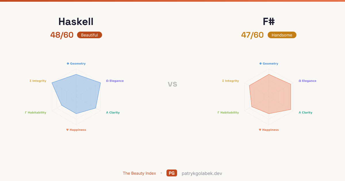 - Haskell lands in the beautiful tier at 48/60; F# in the handsome tier at 47/60. The gap is narrow enough that team familiarity and ecosystem fit should decide. Pick the one your hires already know. The score difference reflects years of community use, tooling maturity, and the editorial judgment of the Beauty Index rubric.