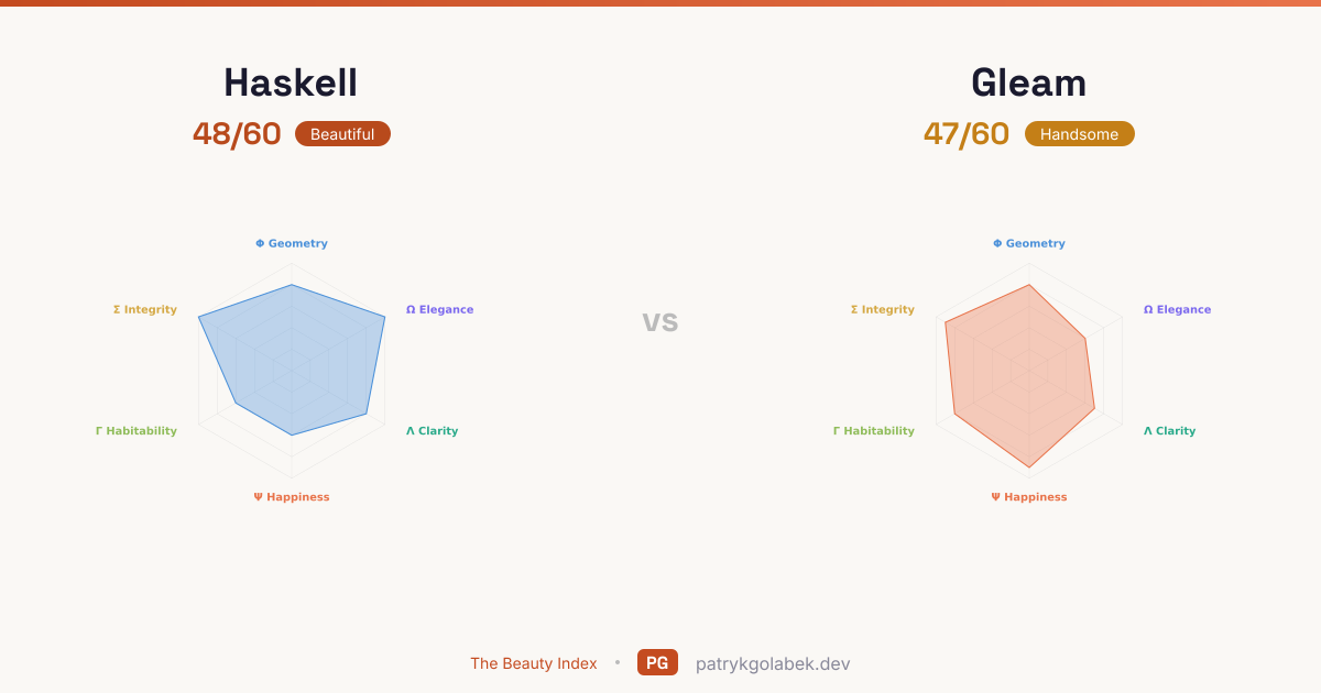 - Haskell lands in the beautiful tier at 48/60; Gleam in the handsome tier at 47/60. At this score gap the choice turns on context. Evaluate the two against the specific project rather than in the abstract. The score difference reflects years of community use, tooling maturity, and the editorial judgment of the Beauty Index rubric.