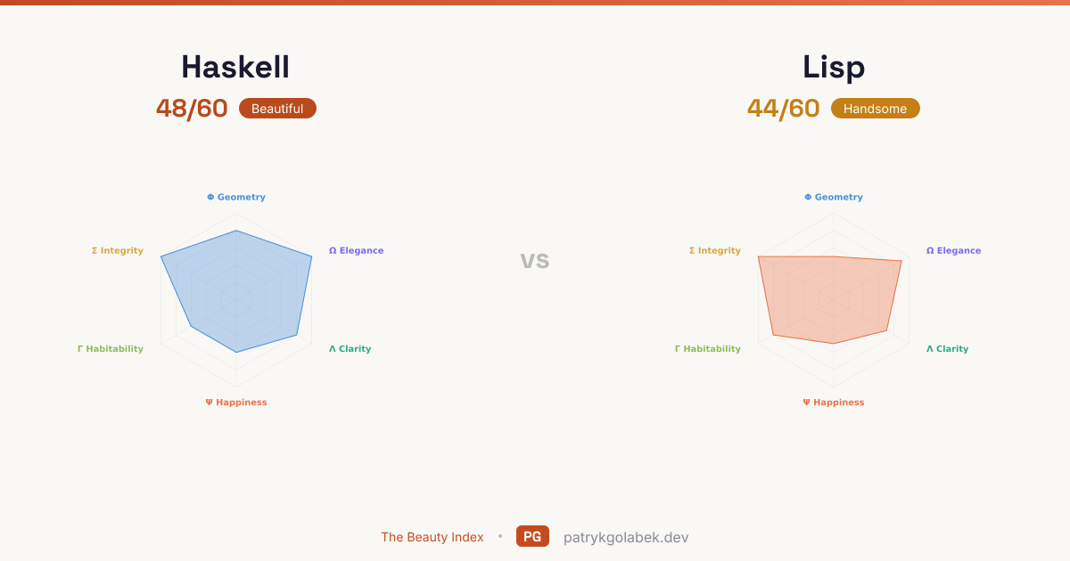 - Haskell lands in the beautiful tier at 48/60; Lisp in the handsome tier at 44/60. The gap is wide enough to matter in day-to-day experience. Pick the higher scorer unless a hard constraint pushes otherwise. The score difference reflects years of community use, tooling maturity, and the editorial judgment of the Beauty Index rubric.