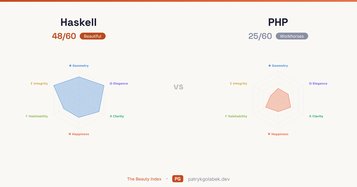 - Haskell lands in the beautiful tier at 48/60; PHP in the workhorses tier at 25/60. The gap is wide. Unless a specific platform or ecosystem constraint forces the other choice, go with the higher-scoring language. The score difference reflects years of community use, tooling maturity, and the editorial judgment of the Beauty Index rubric.