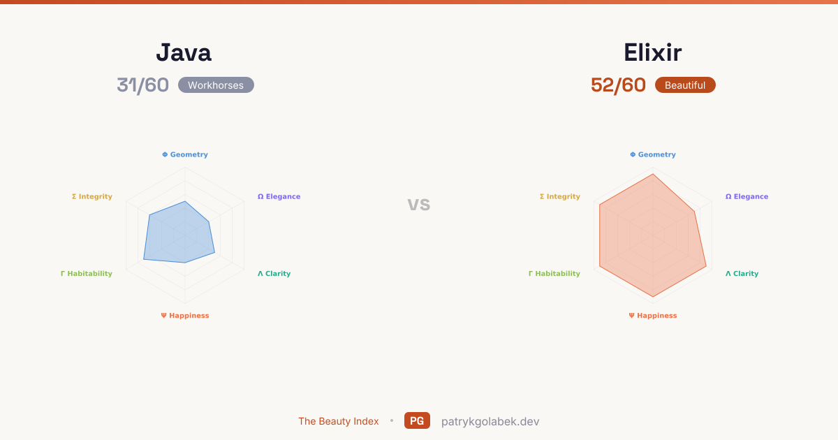 Elixir scores 52/60 against Java's 31/60, leading in 6 of 6 dimensions. Elixir dominates the aesthetic, mathematical, human, and design axes. Read the comparison through Practitioner Happiness first: Elixir wins that axis by 5 points over Java, and it is the single best lens on the pair.