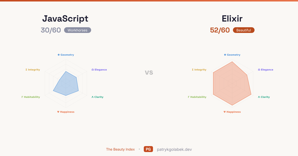 Elixir scores 52/60 against JavaScript's 30/60, leading in 6 of 6 dimensions. Elixir dominates the aesthetic, mathematical, human, and design axes. Read the comparison through Conceptual Integrity first: Elixir wins that axis by 6 points over JavaScript, and it is the single best lens on the pair.