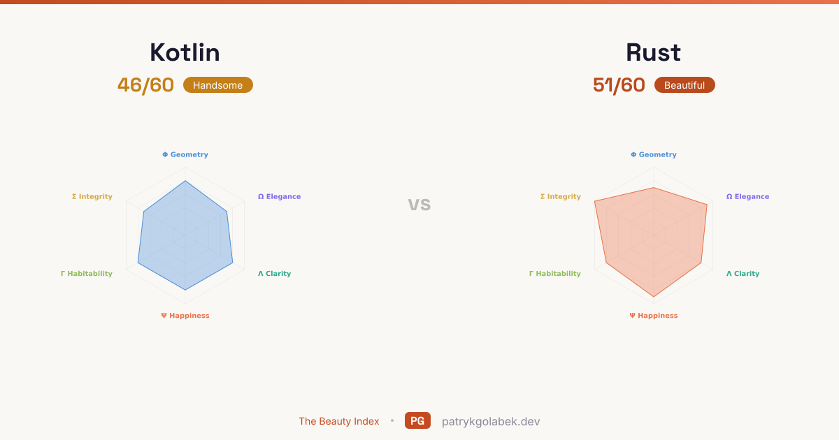 - Kotlin lands in the handsome tier at 46/60; Rust in the beautiful tier at 51/60. With this spread, default to the higher-ranked language and reserve the other for projects where its specific strengths matter. The score difference reflects years of community use, tooling maturity, and the editorial judgment of the Beauty Index rubric.