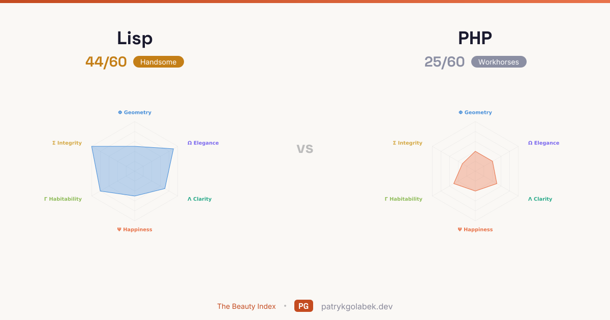 - Lisp lands in the handsome tier at 44/60; PHP in the workhorses tier at 25/60. With this much daylight between them, the higher scorer is the default and the lower scorer needs a business case. The score difference reflects years of community use, tooling maturity, and the editorial judgment of the Beauty Index rubric.