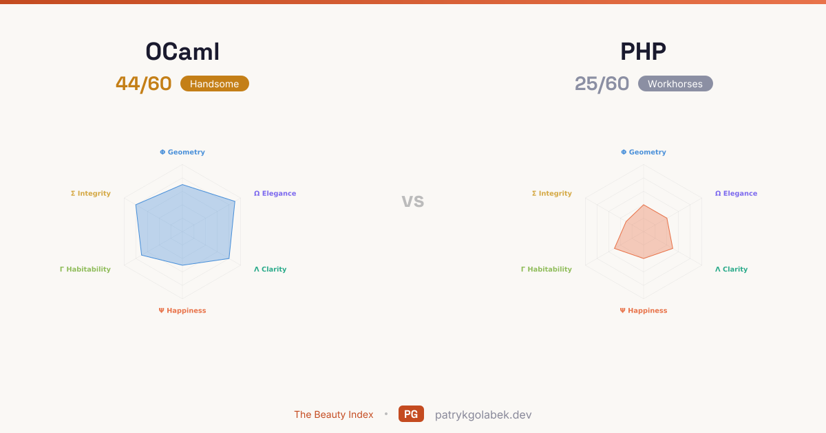 - OCaml lands in the handsome tier at 44/60; PHP in the workhorses tier at 25/60. With this much daylight between them, the higher scorer is the default and the lower scorer needs a business case. The score difference reflects years of community use, tooling maturity, and the editorial judgment of the Beauty Index rubric.