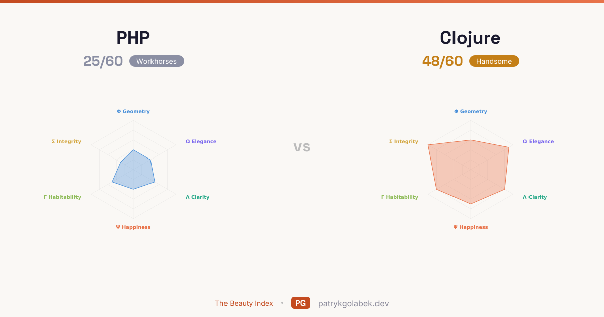 - PHP lands in the workhorses tier at 25/60; Clojure in the handsome tier at 48/60. With this much daylight between them, the higher scorer is the default and the lower scorer needs a business case. The score difference reflects years of community use, tooling maturity, and the editorial judgment of the Beauty Index rubric.