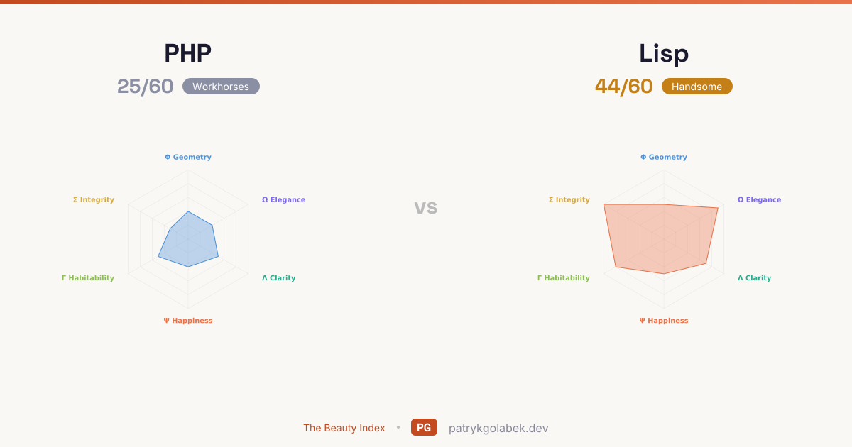 - PHP lands in the workhorses tier at 25/60; Lisp in the handsome tier at 44/60. The gap is wide. Unless a specific platform or ecosystem constraint forces the other choice, go with the higher-scoring language. The score difference reflects years of community use, tooling maturity, and the editorial judgment of the Beauty Index rubric.