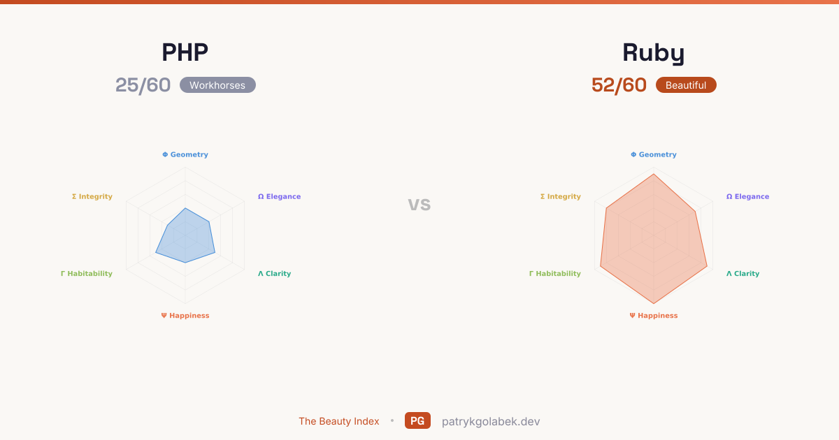 Ruby scores 52/60 against PHP's 25/60, leading in 6 of 6 dimensions. Ruby dominates the aesthetic, mathematical, human, and design axes. Read the comparison through Practitioner Happiness first: Ruby wins that axis by 6 points over PHP, and it is the single best lens on the pair.