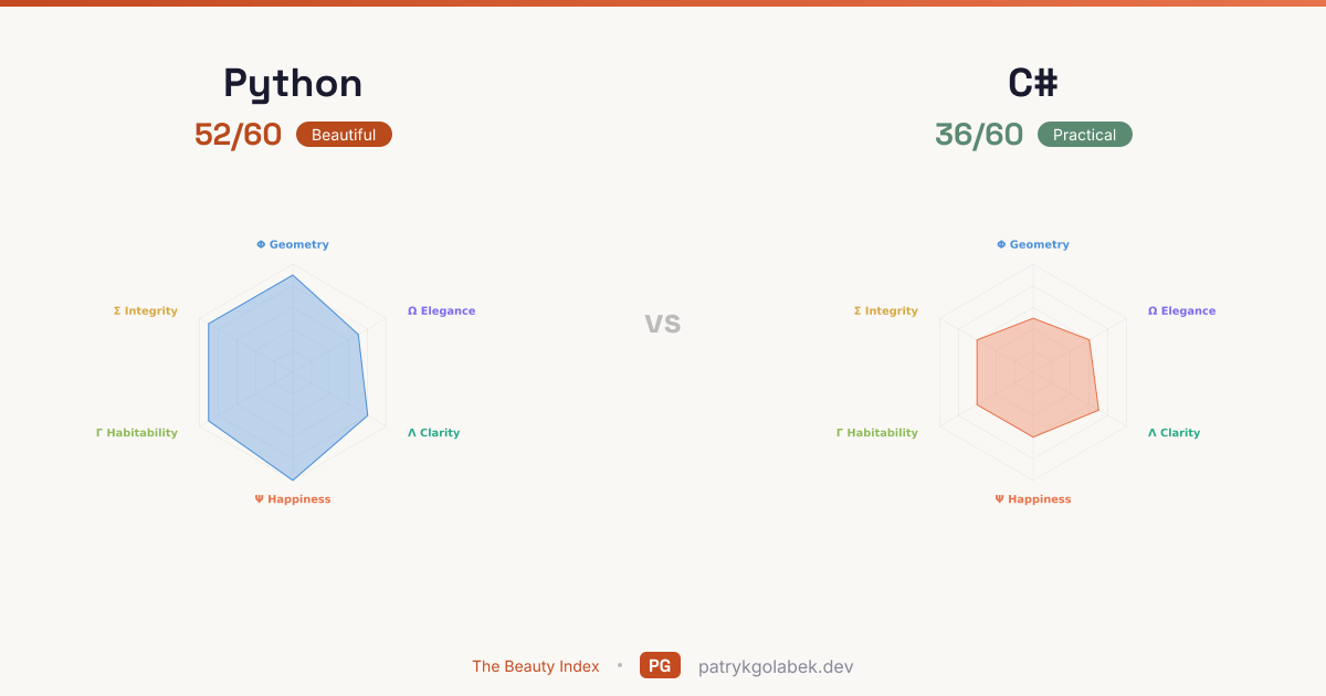 Python wins Aesthetic Geometry by 4 points — a clear geometric edge. Indentation is syntax. Python enforces geometric structure at the grammar level. A screenful of Python has natural visual rhythm with minimal punctuation noise. C#, by contrast, accepts visual density in exchange for other priorities. C# has reduced ceremony significantly with top-level statements, records, and file-scoped namespaces. But the language's Java-era heritage still shows in verbose patterns, property accessors, attribute decorations, and using blocks add visual weight. Improving, but not yet clean. In a language where expressiveness is the selling point, visual calm amplifies the advantage.