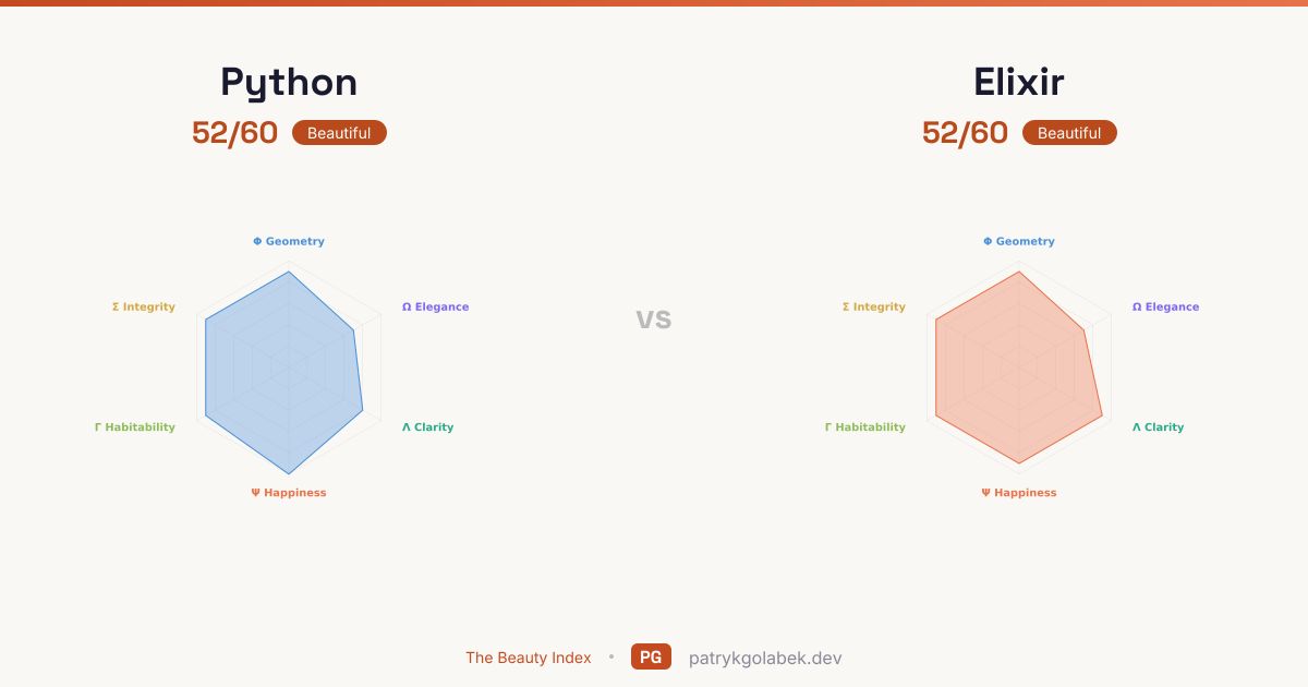 - Python lands in the beautiful tier at 52/60; Elixir in the beautiful tier at 52/60. The gap is narrow enough that team familiarity and ecosystem fit should decide. Pick the one your hires already know. The score difference reflects years of community use, tooling maturity, and the editorial judgment of the Beauty Index rubric.