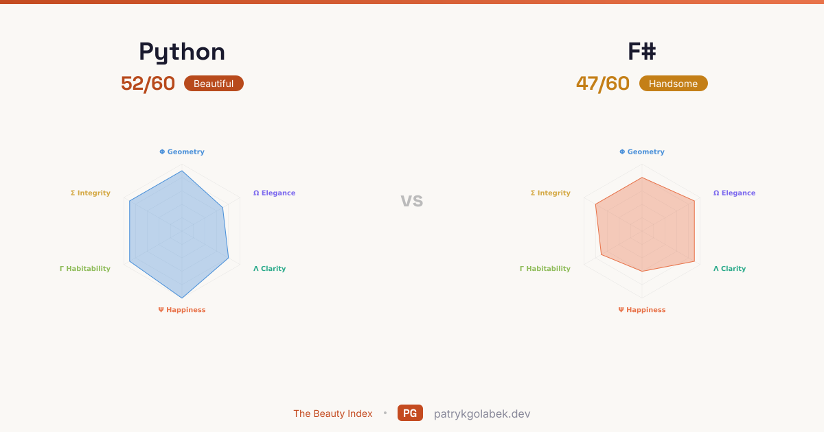 - Python lands in the beautiful tier at 52/60; F# in the handsome tier at 47/60. The gap is wide enough to matter in day-to-day experience. Pick the higher scorer unless a hard constraint pushes otherwise. The score difference reflects years of community use, tooling maturity, and the editorial judgment of the Beauty Index rubric.