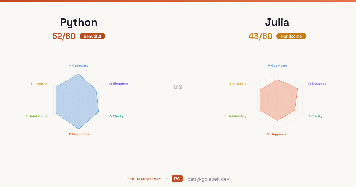 - Python lands in the beautiful tier at 52/60; Julia in the handsome tier at 43/60. The gap is wide. Unless a specific platform or ecosystem constraint forces the other choice, go with the higher-scoring language. The score difference reflects years of community use, tooling maturity, and the editorial judgment of the Beauty Index rubric.