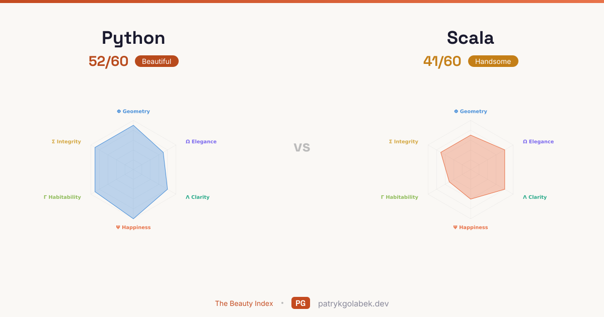 - Python lands in the beautiful tier at 52/60; Scala in the handsome tier at 41/60. With this much daylight between them, the higher scorer is the default and the lower scorer needs a business case. The score difference reflects years of community use, tooling maturity, and the editorial judgment of the Beauty Index rubric.