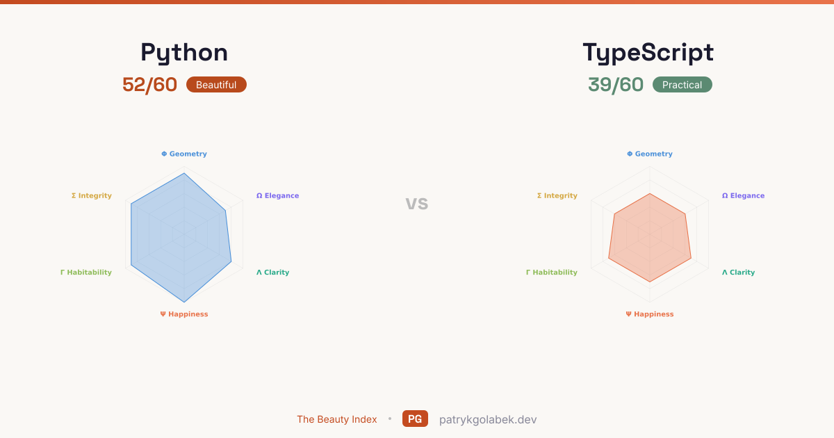 - Python lands in the beautiful tier at 52/60; TypeScript in the practical tier at 39/60. With this much daylight between them, the higher scorer is the default and the lower scorer needs a business case. The score difference reflects years of community use, tooling maturity, and the editorial judgment of the Beauty Index rubric.