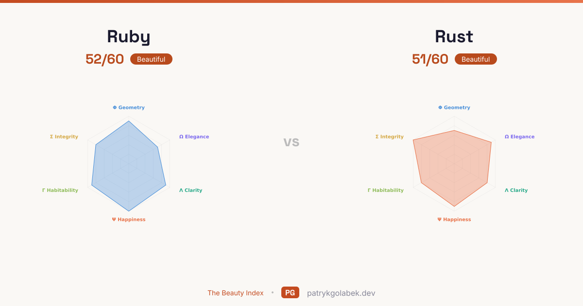 - Ruby lands in the beautiful tier at 52/60; Rust in the beautiful tier at 51/60. The gap is narrow enough that team familiarity and ecosystem fit should decide. Pick the one your hires already know. The score difference reflects years of community use, tooling maturity, and the editorial judgment of the Beauty Index rubric.
