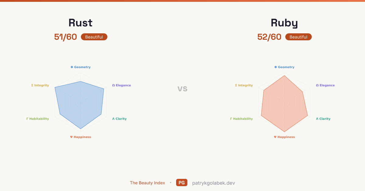 - Rust lands in the beautiful tier at 51/60; Ruby in the beautiful tier at 52/60. With so little between them on raw score, choose on ecosystem: the library set, hiring market, and tooling you already own. The score difference reflects years of community use, tooling maturity, and the editorial judgment of the Beauty Index rubric.