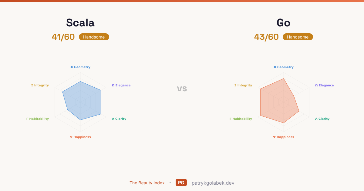 - Scala lands in the handsome tier at 41/60; Go in the handsome tier at 43/60. The gap is narrow enough that team familiarity and ecosystem fit should decide. Pick the one your hires already know. The score difference reflects years of community use, tooling maturity, and the editorial judgment of the Beauty Index rubric.