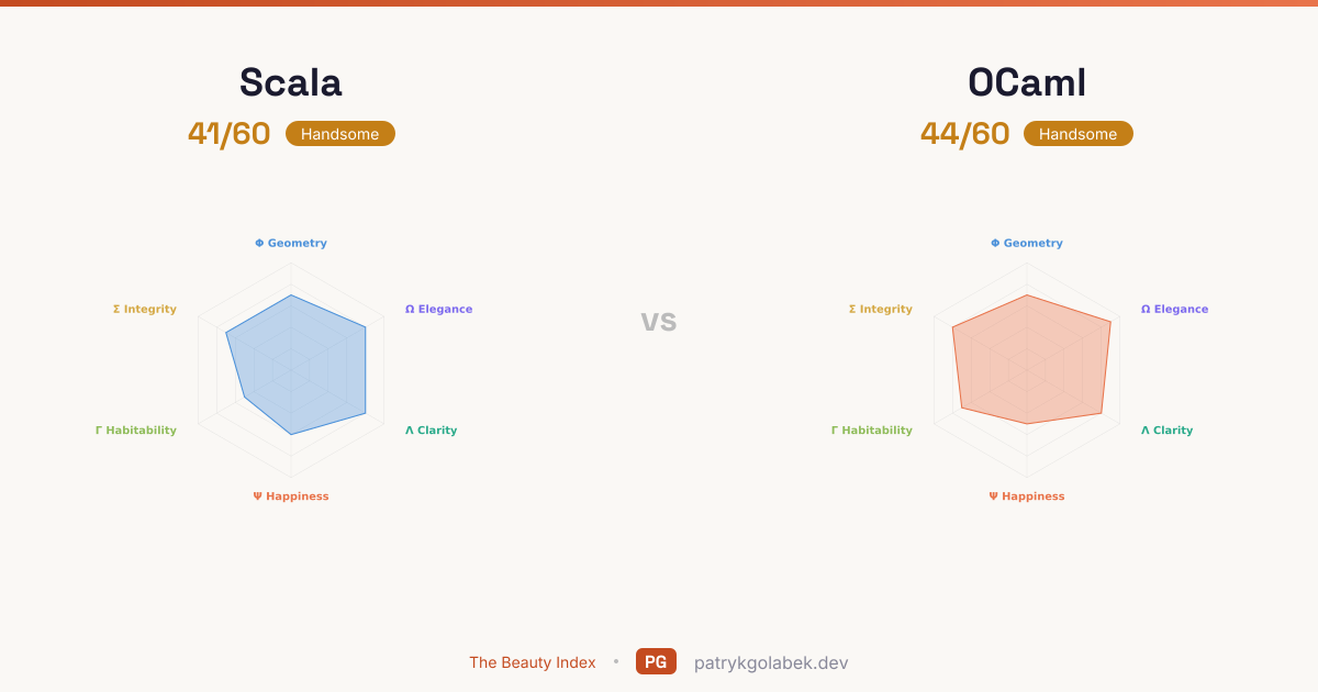 - Scala lands in the handsome tier at 41/60; OCaml in the handsome tier at 44/60. The gap is narrow enough that team familiarity and ecosystem fit should decide. Pick the one your hires already know. The score difference reflects years of community use, tooling maturity, and the editorial judgment of the Beauty Index rubric.