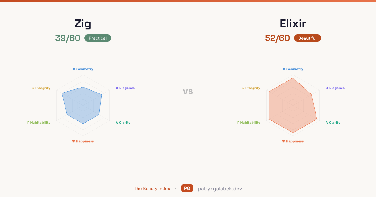 Elixir wins Aesthetic Geometry by 3 points — an unmistakable aesthetic lead. Pipeline operators, pattern-matching clauses, and module structure create a visual flow that scans beautifully. Elixir code looks like a series of clean, evenly weighted transformation steps. Set the two side by side and the shape of each language announces itself before you read a single identifier. Clean and minimal but not visually distinctive. Zig code is functional and well-structured, but the syntax doesn't create the kind of visual rhythm that scores above 7. Workmanlike layout. For application code the geometry translates directly into readability for new contributors.